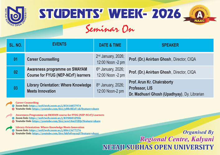 01.01.2026: Students' Week 2026 organised by Regional Centre, Kalyani, NSOU...Detail